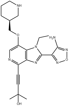 英文名称:4-[2-(4-Amino-1,2,5-oxadiazol-3-yl)-1-ethyl-7-[(3S)-3-piperidinylmethoxy]-1H-imidazo[4,5-c]pyridin-4-yl]-2-methyl-3-butyn-2-ol CAS号:937174-76-0 分子式:C21H27N7O3 分子量:425.48